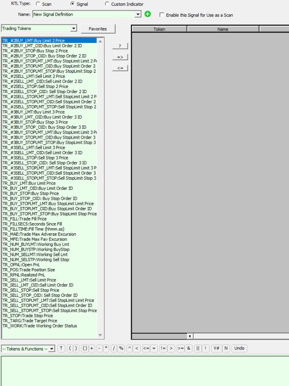 To quickly access the full list of TR_ tokens available, open the RTL setup window (File > New > RTL Object) and choose Trading Tokens from the token selection menu. Scroll down the alphabetical list to see all of the TR_ tokens listed.