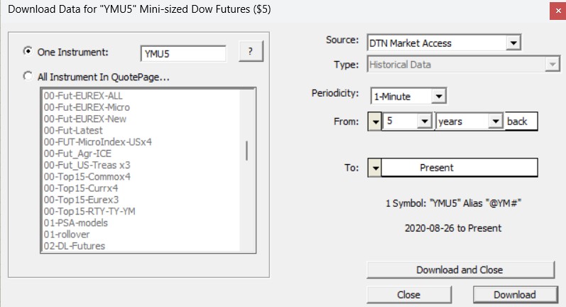 - Download Source and Type: you will generally use DTN MA (or IQFeed) as download source and have "Historical Data" automatically selected for such data source