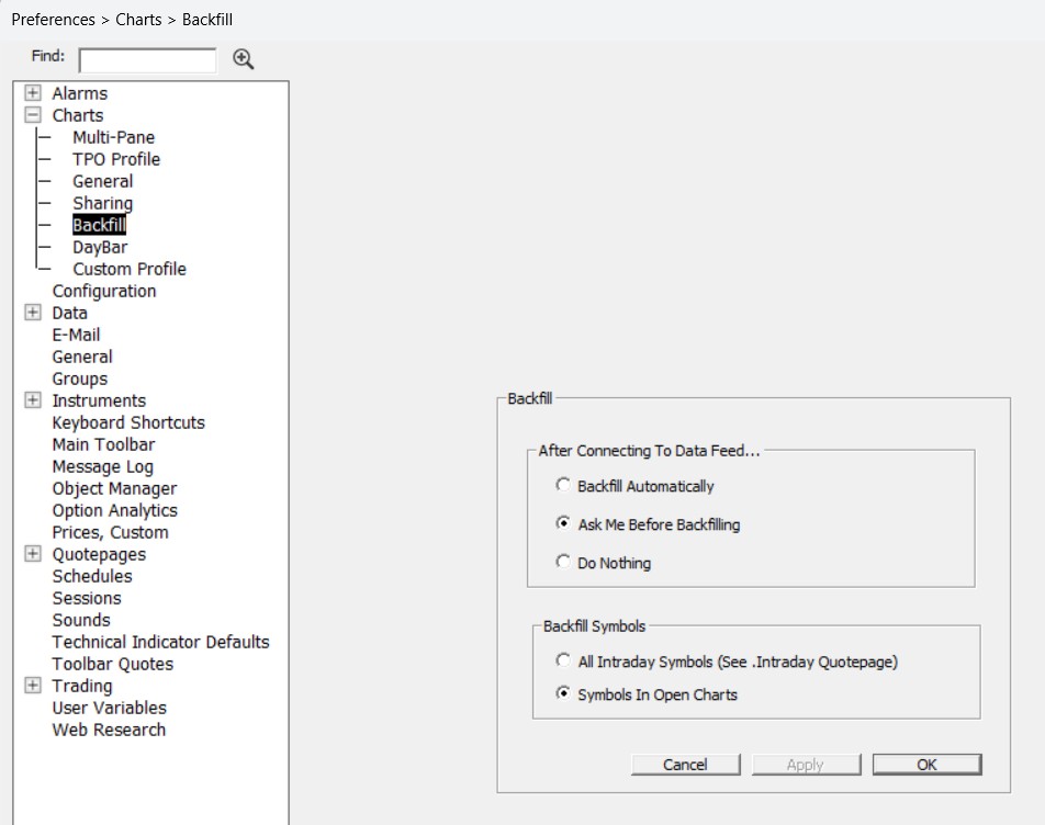 Doing so will enable Charts > Backfill preference window to appear and allow the user control on whether to auto backfill or not (whenever I/RT starts), and whether to auto backfill all intra-day symbols or just those open in charts (as it was the improved backfill automation mode was introduced in I/RT 11.2)