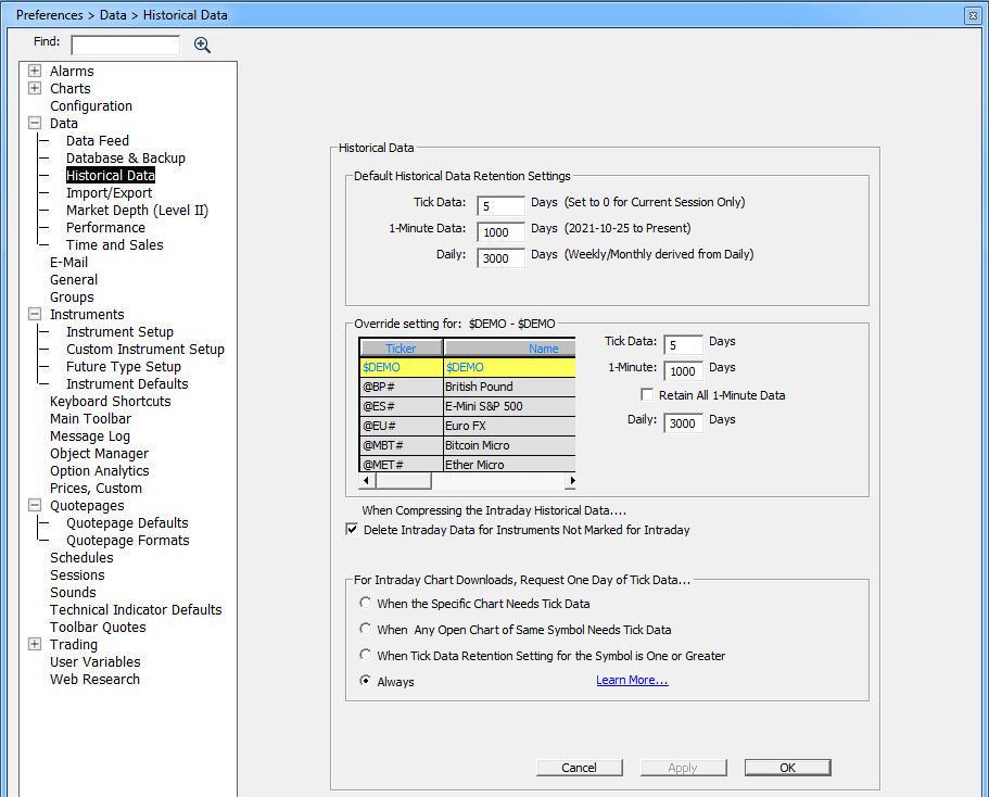 The Historical Retention Preferences window is used to control the amount of historical data stored on the Investor/RT database and to specify other options relating the downloading/maintenace of historical data. Prudent limits on data retention will help manage your computer resources and optimize performance of the software.