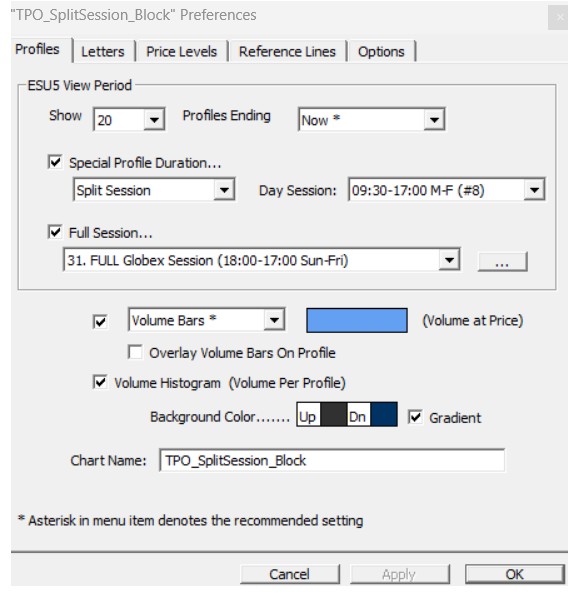Cumulative profiles over the last X session, for both TPO and Volume profiles, can be added on each side of the charts. X=2 on a split session TPO chart will correspond to a full session profile being displayed (during the Day Session action).