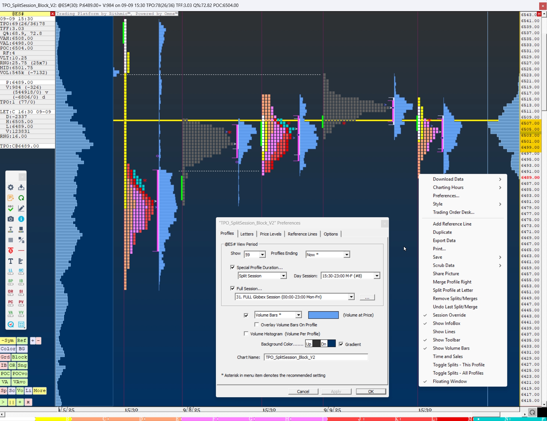 But some other chart features, settings or menus are specific to TPO charts: we provide below an overview of the user interface menus and keyboard shortcuts needed to easily control (symbol & session selection, profile merging/splitting features, chart scrolling controls, etc) and manipulate the different elements of a TPO charts