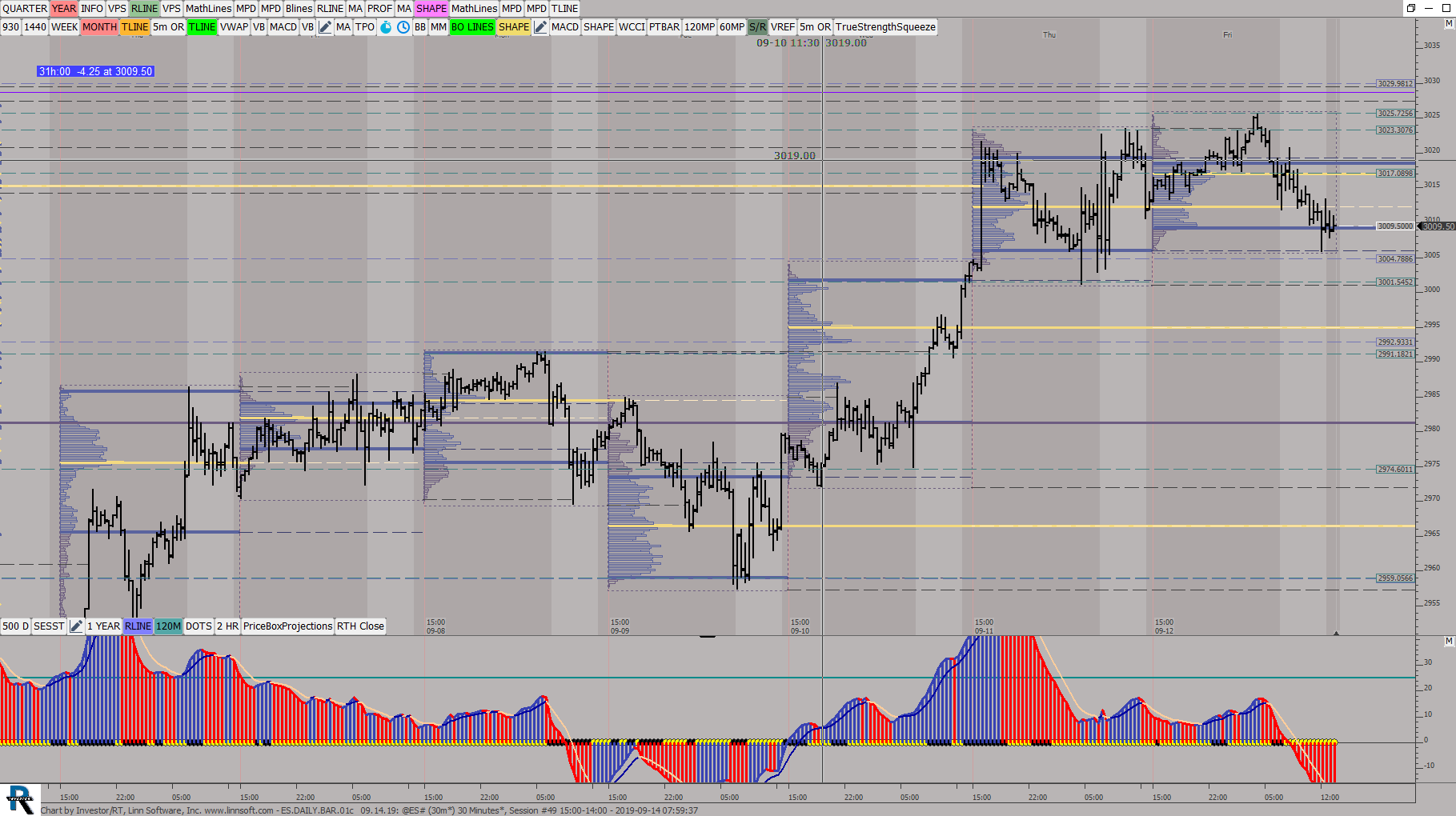 Weekly VP's, 240 Min Candles. This chart was uploaded by Investor/RT 13.6.3 showing symbol: @ESZ19. |