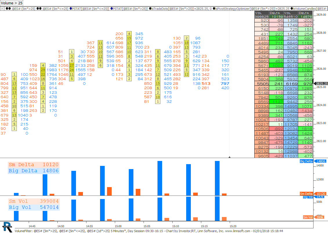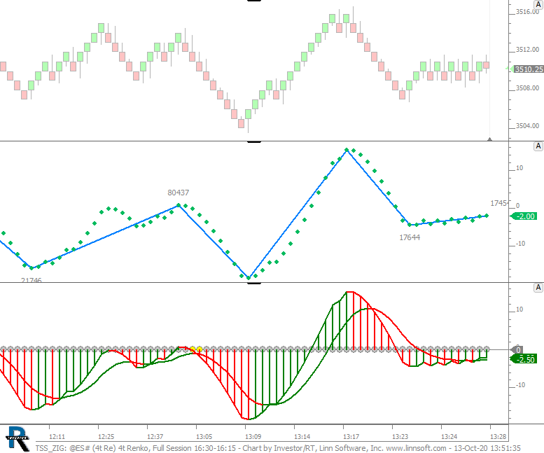Volume Filtering with Zig Zag and Zig Zag Oscillator. This chart is explained in the video Volume Filtering: Studying Behavior of Large vs Small Trades. |
