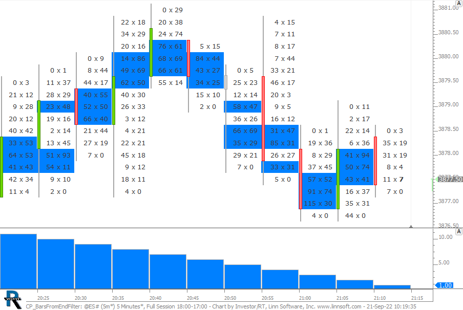 Chart Displays Bars Into Session in Annotation. To move to another chart, drag the Position Indicator (blue histogram) to the scale at bottom of target chart. |
