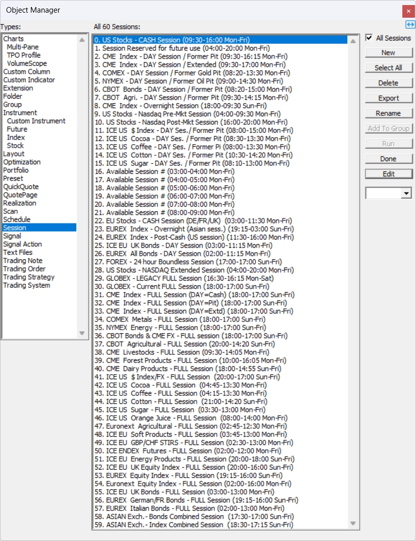 Please review the Sessions 101 support page for an in-depth presentation of the potential use of each individual session as "Full" session, "Day" Session or "Chart Session", and a presentation of the recommended full & day session pairs for each main US and European future markets.