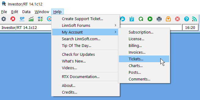 Finally, the Investor/RT Help Menu provides convenient access to your LinnSoft account including licensing, billing and subscription details. Choose from the Help > My Account submenu.