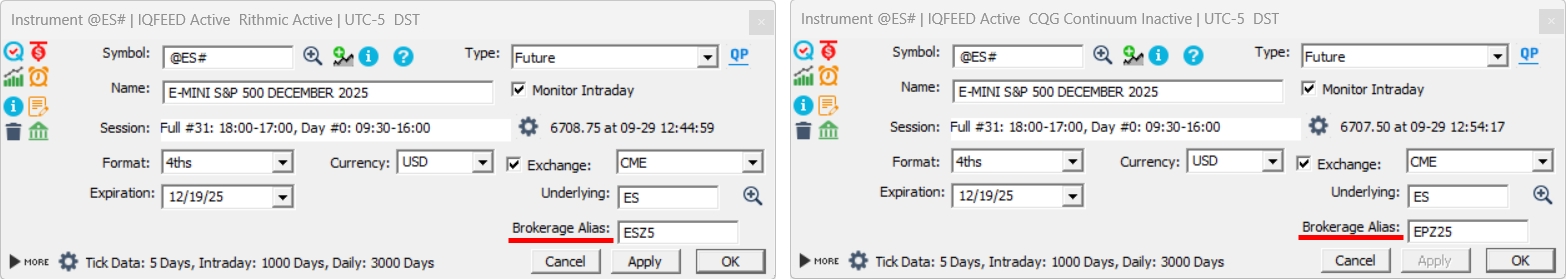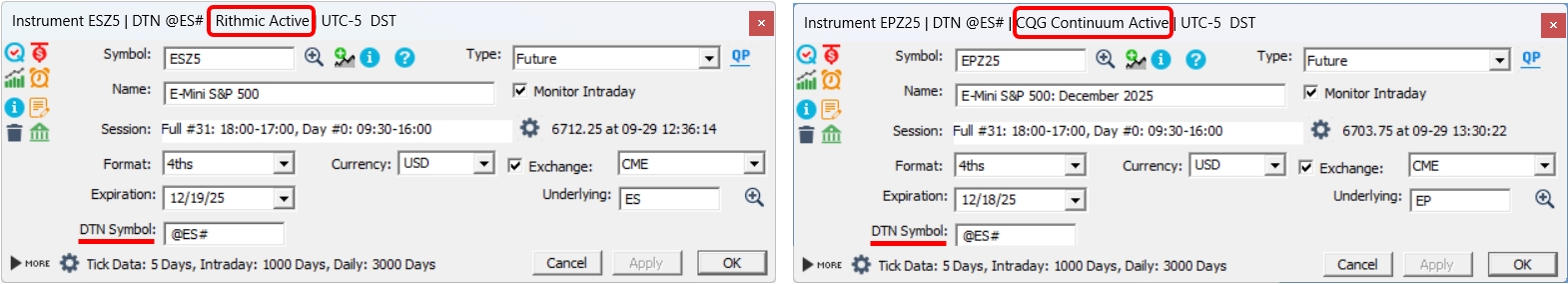 The following screenshot reflects the settings for the E-Mini S&P 500 contract expiring in December 2025 for an IR/T user located in the Eastern Time Zone, with a Rithmic (resp. CQG on the right) data feed configuration.