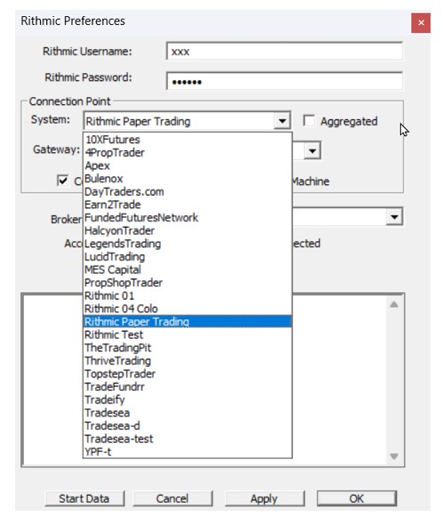 - In the Rithmic connection preferences window, on top of the Rithmic connection point dedicated to live money account (usually Rithmic 01), you will find the list of ALL prop firm offering specific connection points and gateway servers. Your prop firm (offering a Rithmic evaluation) is not showing up on the list: this means your firm is still using the generic "Rithmic Paper Trading" connection point (This is, for example, the case for Blusky, EliteTraderFunding or TakeProfitTrader)