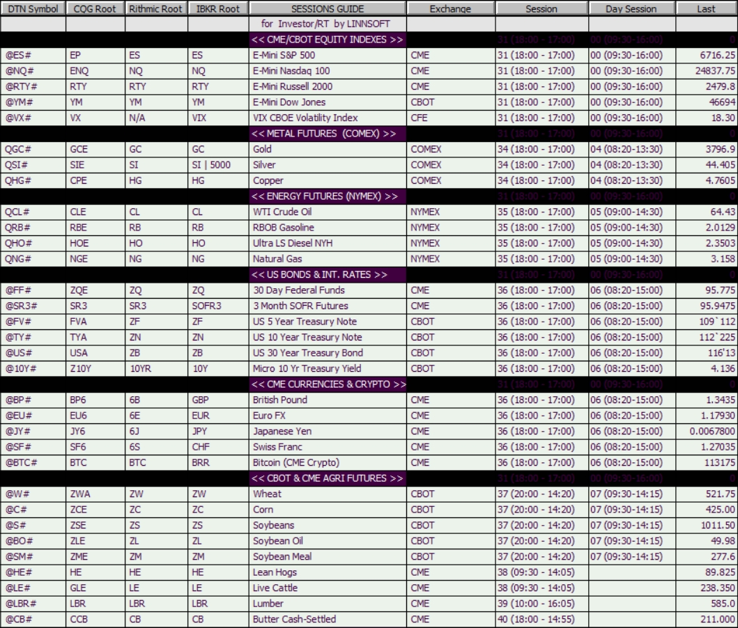 Note: there are also some specific FULL (short) sessions defined for CME livestocks (Session #38), Forest (Session #39) and Diary products futures (Session #40)