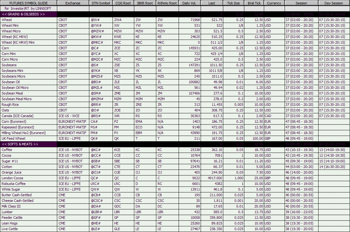 - The DTN coverage of future markets goes beyond the symbols listed on these 5 tables. It also includes futures traded on the following exchanges: LME, MDEX (Malaysia), BMF (Brazilian Merc. & Futures Exchange) and SAFEX/JSE (Johannesburg).