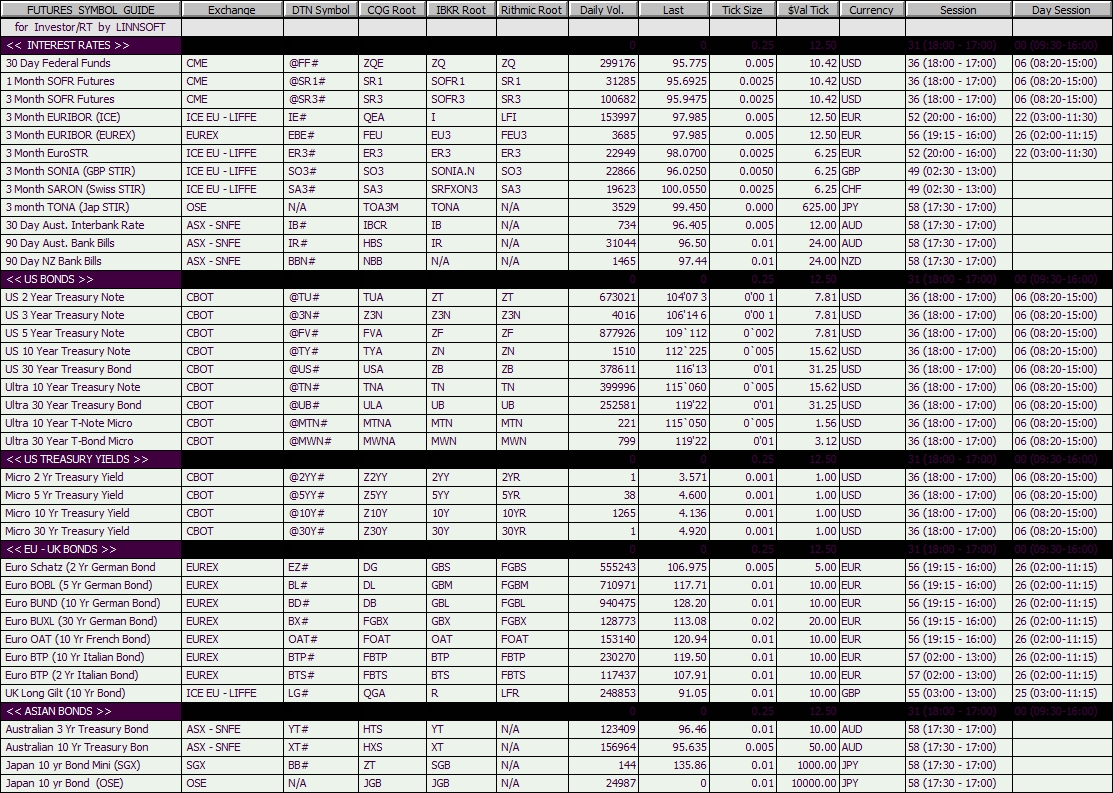 Warning / Good Practice: Whenever adding a new symbol to your Investor/RT instance for the first time (or during a rollover procedure), ensure that the full and day sessions are correct before proceeding with a "full download" operation. This should be the case for Future symbols, but not necessarily for any cash indexes or statistics listed in the coming tables(if their full session doesn't correspond to the default US cash session #00)