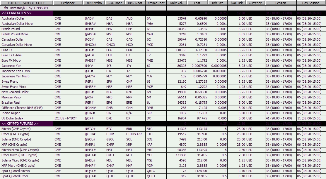 Remark: The 5 tables below also include an "Exchange" column for information purposes only. This input is not essential in the case of DTN (and could be left to "AUTO" when manually setting up a new future). Indeed, as this is also the case with a live CQG subscription, based on the symbol ticker, I/RT will automatically retrieve from the DTN servers the exchange name information (At the opposite, a Rithmic or IBKR ticker will only be recognized if the exchange name of the Investor/RT instrument setup window is perfectly matching the one stored in their own symbol library)