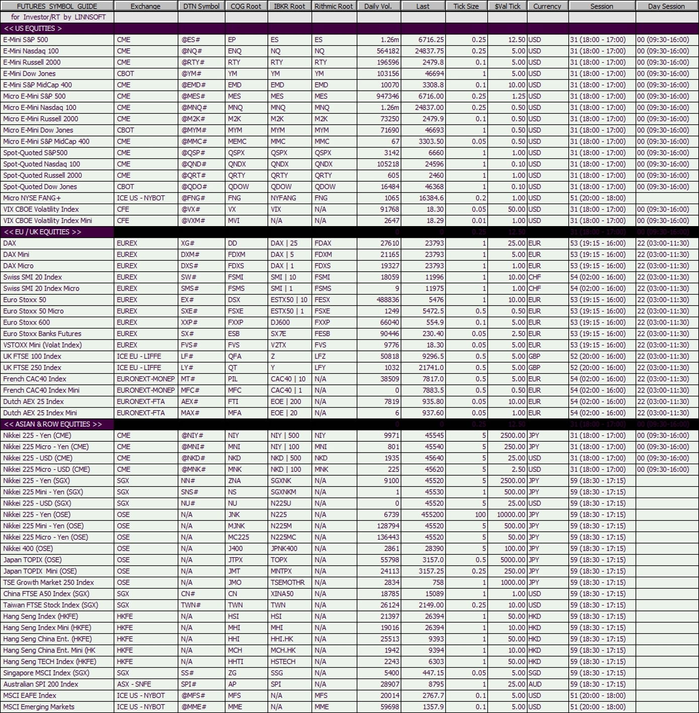 For an easy read, the following 5 tables, gathering future symbols per market category, highlight the following information: