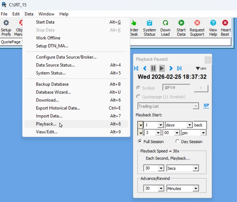 Use Data > Playback (Alt+8) to open the Playback window and specify the ticker symbol (or QuotePage of symbol) you wish to playback.