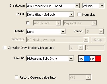 - Big Bar Delta - This result accumulates the buying volume and selling volume of each 1 second period. It also accepts a volume filter which is placed in the "Consider Trades With Volume" field. If the buy volume of any given second exceeds the volume filter supplied, it is accumulated into the buying volume of the bar. If the sell volume of any second exceeds the filter, it is accumulated into the sell volume of the bar. The result for each bar is the accumulated buy volume minus the accumulated sell volume. This result essentially applies a filter, not on every trade, but on an accumulation of the trades within each 1 second period.