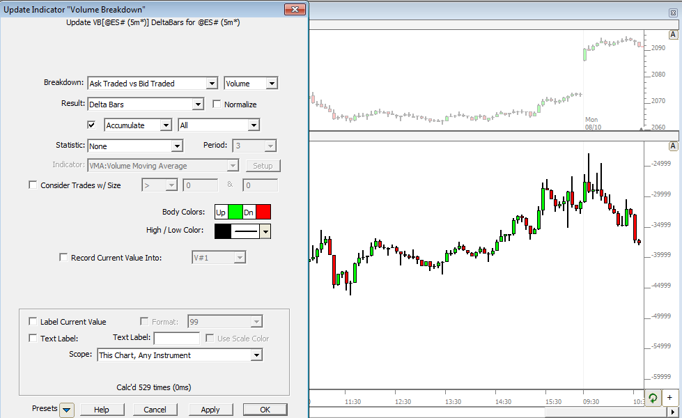 The chart below shows the Volume Breakdown setup with common settings for cumulative delta bars.