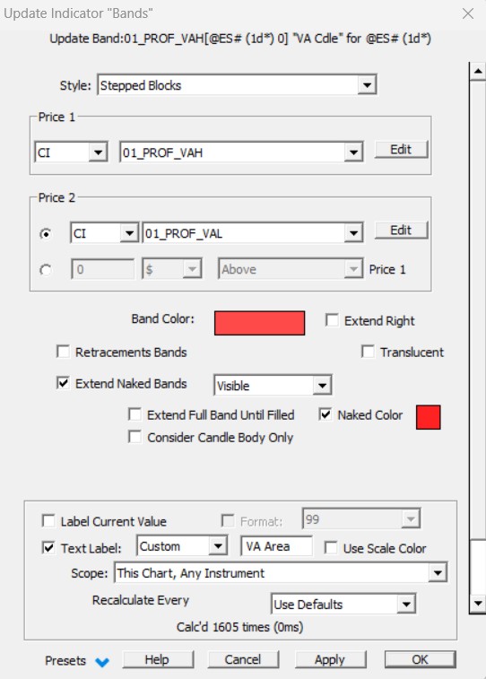 This tips page is focused on how to display a Value Area “Candle” (or bands) on a traditional candle charts