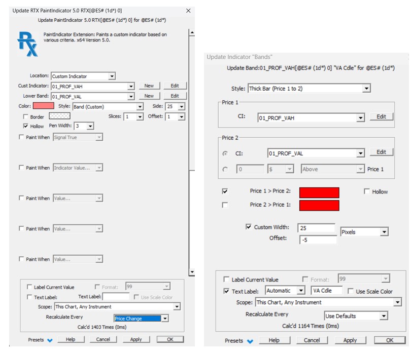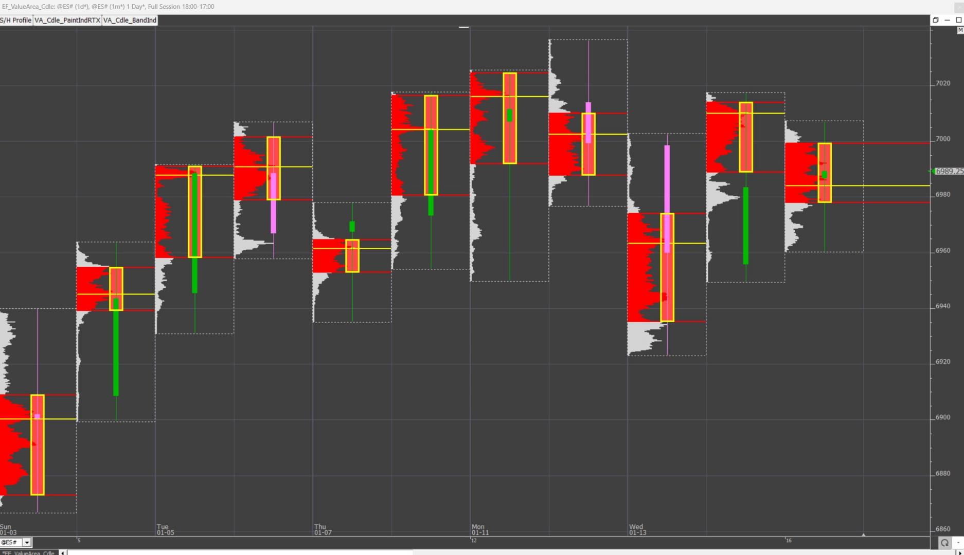 - Using the Paint Indicator to display custom candle reflecting the Profile Value Area on a daily chart periodicity (set to match the current day session)