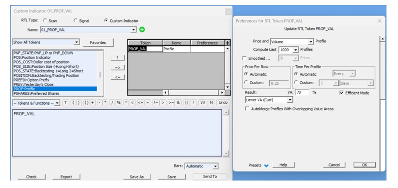 When it comes to display a candle based on the Profile Value Area High and Low, (on a 1d* charty, ie a daily periodicity built from intraday data), you first need to create 2 custom indicators using the Profile token, ie one CI returning the Value Area High, and the other the Value Area Low