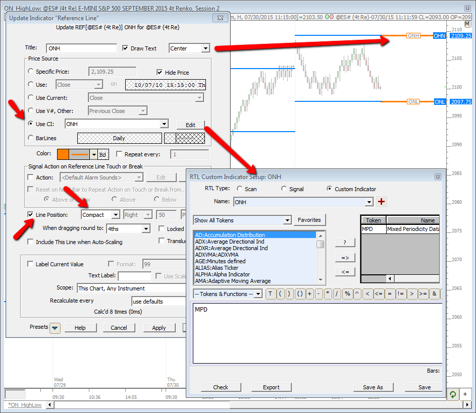 How can I plot the ONH and ONL as compact lines? Simply create custom indicators, one for ONH and one for ONL. The sytnax for both would simply be MPD, with proper setup of preferences accordingly. Then add Reference Lines for each to the chart which "Use CI" and are setup as Compact. The image below tells the story, and this chart definition includes both the historical lines (blue) and the compact lines (orange). You can drag and drop either or both from this chart to another chart after importing. Remember you can right-click on these lines and "Bring to Front" or "Send to Back" if needed.