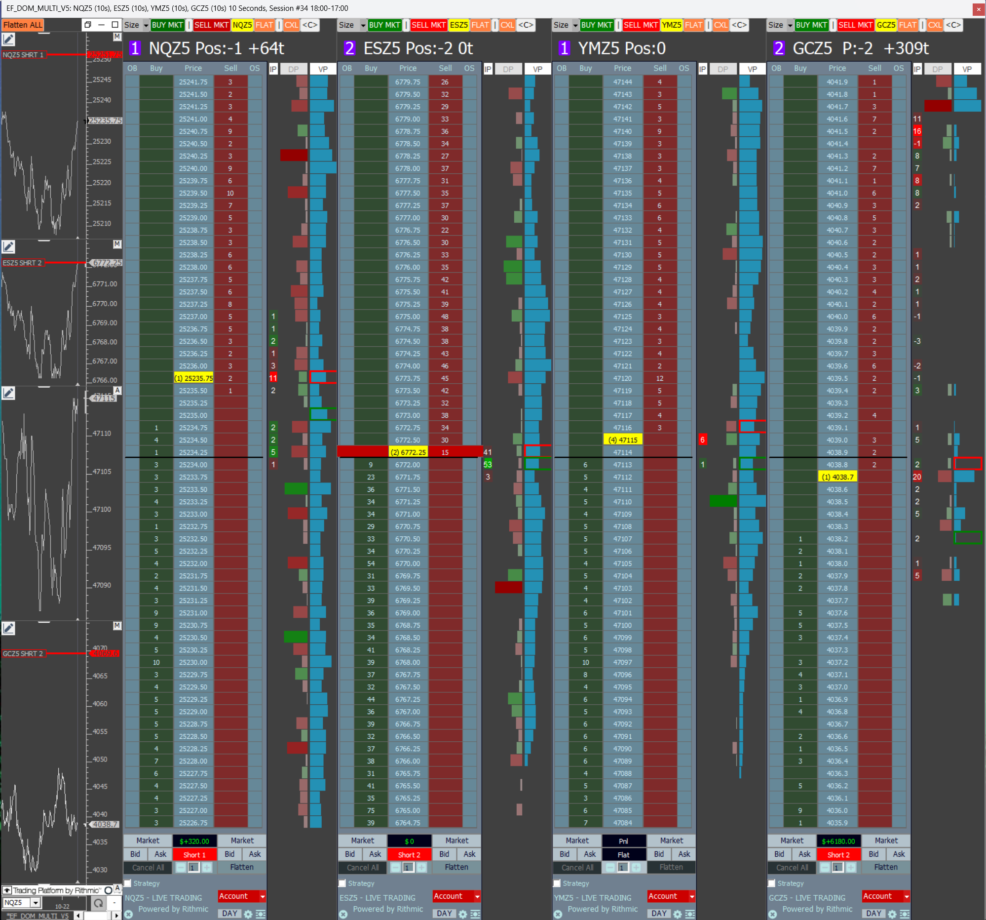 On top of each DOM, I have added some custom buttons with a trade size selection menu for Buy/Sell mkt actions, together with the flatten/cancel buttons and a position / P&L summary. On the chart section itself on the left, you have 4 small charts for each instrument, where you can also see the entry fill prices (or resting working orders) for each instrument, together with an instrument selection button for each chart/DOM. Finally, you also have a flattenALL button at the top (to exit all positions at once)