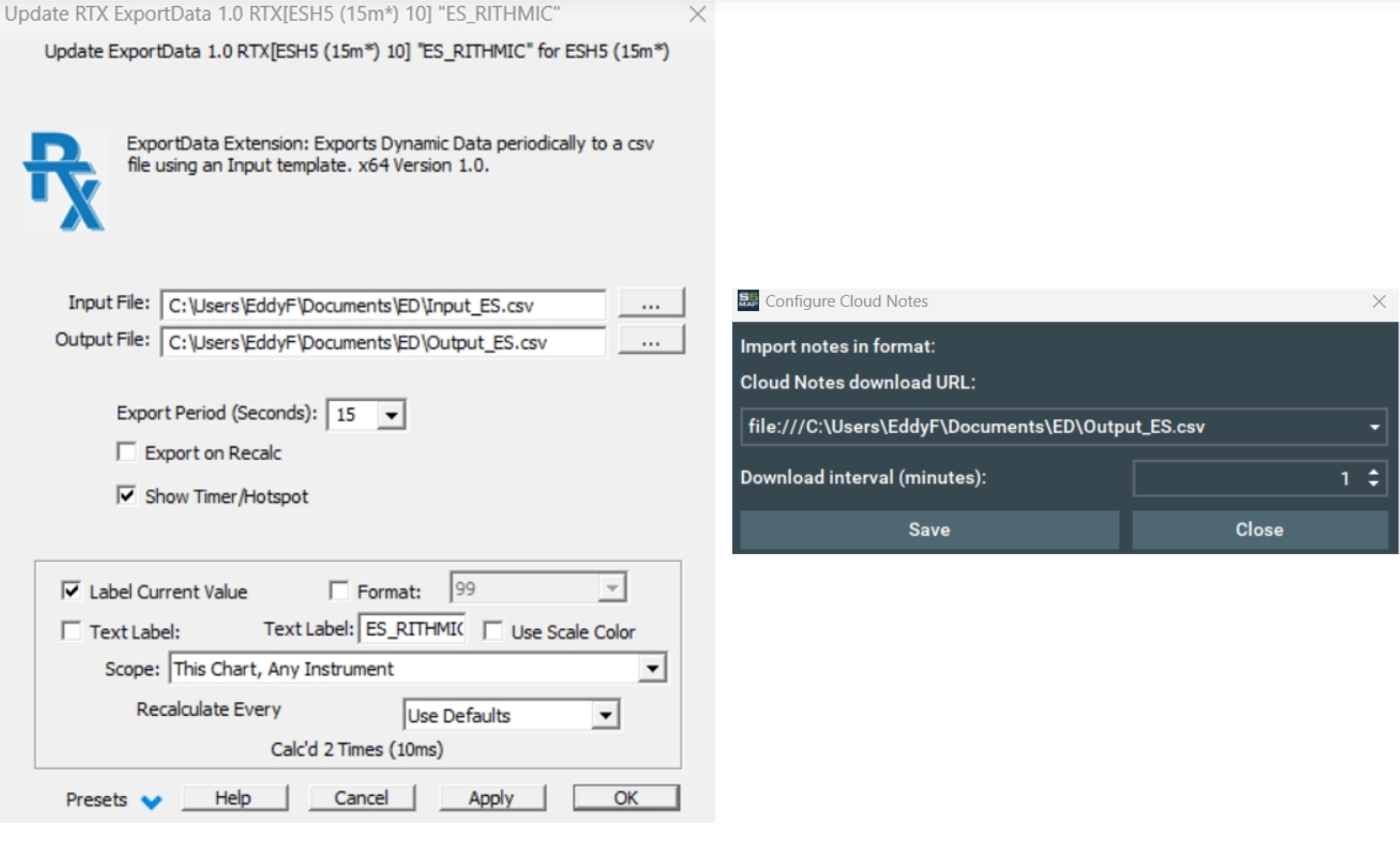 On your side, you need to adjust the "C:\Users\EddyF\Documents\ED" directory address accordingly in both I/RT exportdata RTX settings and BM cloudnotes configuration box. Assuming your username is KeithM and that you have created an "IRTCloudNotes" directory for storing the Input_ES.csv file in my documents, the correct file location will be C:\Users\KeithM\Documents\IRTCloudNotes\Input_ES.csv